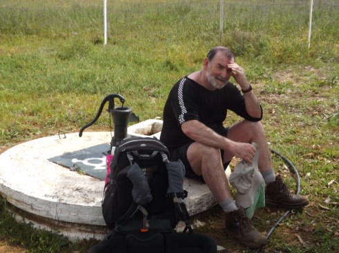 Our destination,Fuente De Cantos,loomed tantalisingly in the distance.We crossed another stream and took a bag break,by a mini cross”.