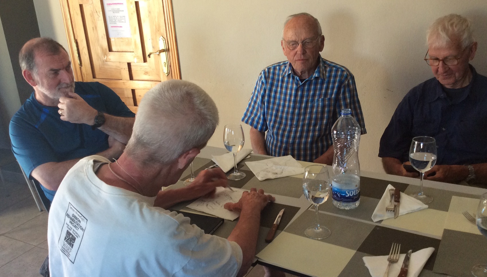 Later, before our ” menu Pelegrino “, Stephen began sketching Jorg, Helmut and Mac, with a biro on table napkins. Thankfully, I escaped as the first courses arrived…..and the wine.