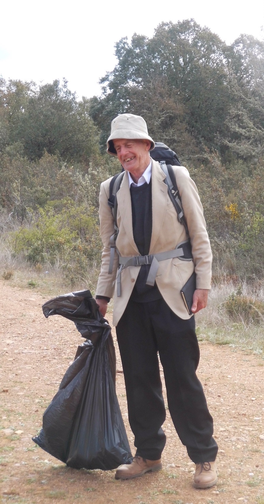 Almost, immediately, a gaunt figure came alongside, wearing the most unlikely walking apparel – a white jacket, over a black pullover, with tailored black trousers and gentleman’s walking boots. A 30 L rucksack was the only concession to orthodox walking gear and in his right hand, a black bin liner. We were confirming our direction , when we were implored to alleviate the load in the liner – ” I’ve bought far too much food..”