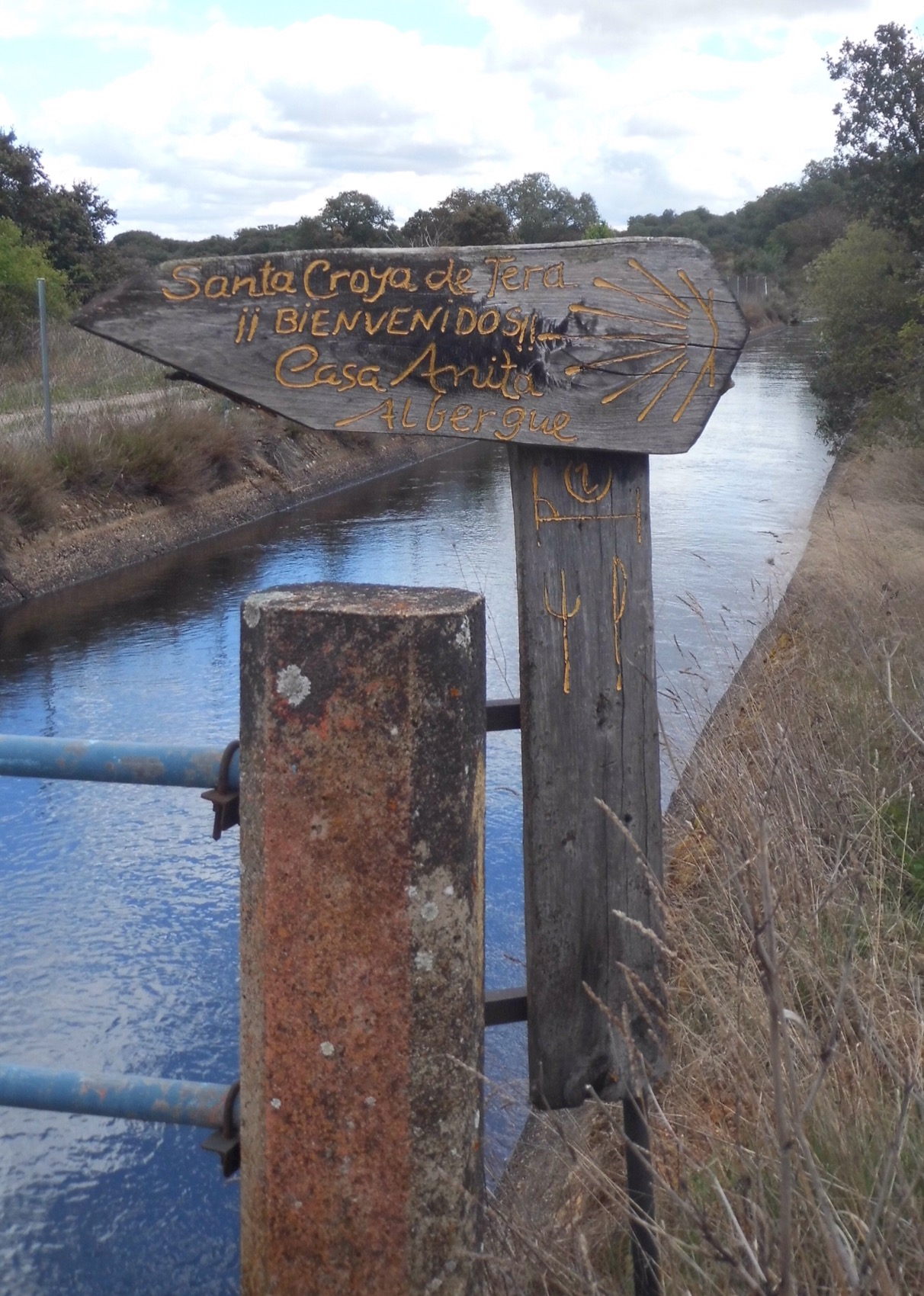 We rounded the edge of an Embalse, in the direction of Villarreal de Farfon, yet another semi-deserted pueblo. I had read that a couple of ex-missionaries, from South Africa, had renovated an old Finca, to make a small albergue. After a long slog we were pleased to come upon their welcoming sign.