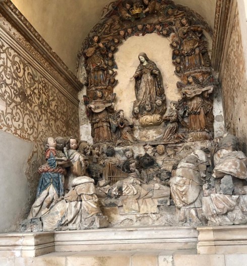 When king Pedro was coronated (1357), he had his murdered wife (Inês) exhumed, placed on the queen’s throne and forced all of his courtiers to kiss her hand. The tomb of Inês de Castro is supported by four gremlin statues, which represent her assassins. The tombs of King Pedro and Inês where badly damaged by French soldiers 1810, who were hoping find jewels and treasures within.