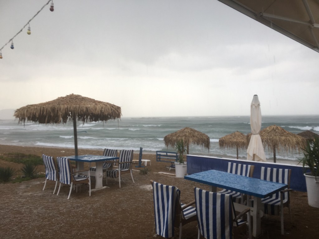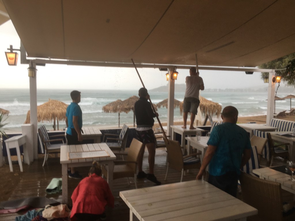 In the evening a brief break in the clouds allowed for a spot of sunbathing and even a dip in the pool ( not me ). Then, taking a chance, a walk was taken around the two bays for pre dinner APERITIVOS at the Blue Sea beachside restaurant. In an instant, the rain became tropical so we scrambled inside the restaurant whilst the staff valiantly pushed large poles up against the awning to remove quickly gathering gallons,or should it be litres? No, “ litres” does not convey the weight of the water!