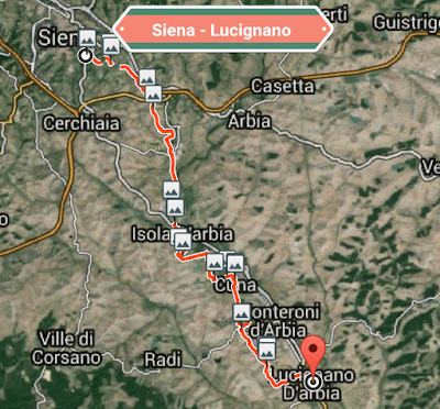 After Cuna the road circles down, through duplex style homes and the on to a narrow path that climbs to a cell phone tower – expect wide vistas over the countryside. Very soon we come to Monteroni d’Arbia, the largest town in the area – all amenities.