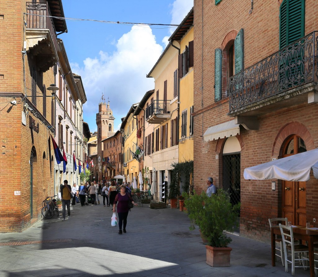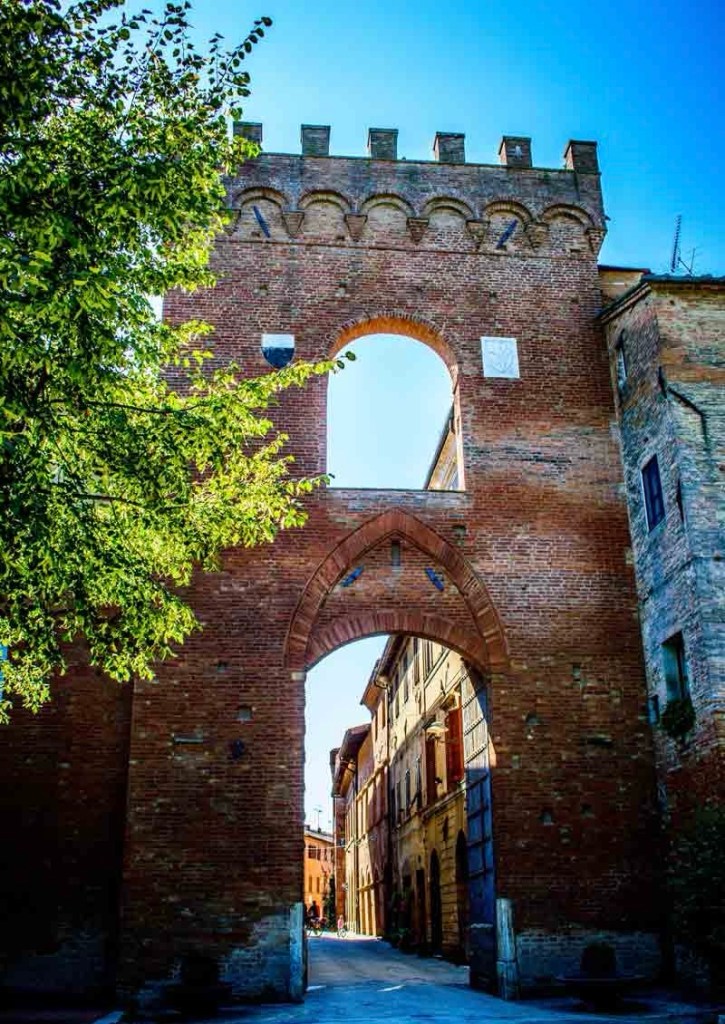 Unusually for this part of Tuscany. It’s a medieval walled town (with post-war expansions) which is situated on a plain (and not a hill) at the intersection of the Arbia and Ombrone rivers, surrounded by the grey clay-scarred hills of the Crete Senesi. Located approximately 16 miles to the south-east of Siena ,the town became an important trading centre in the thirteenth century and later a military town for the City State of Siena, which presumably triggered the need for the high town walls and gates which were constructed between 1371 and 1383.