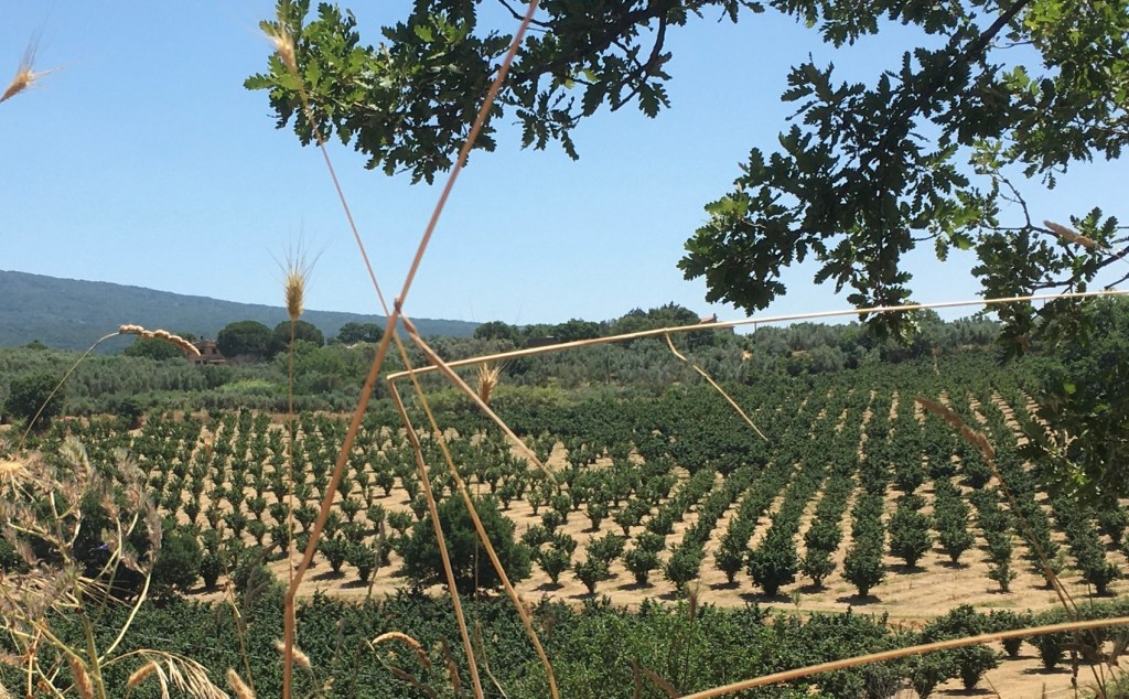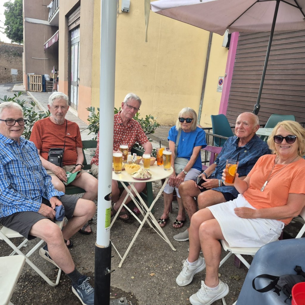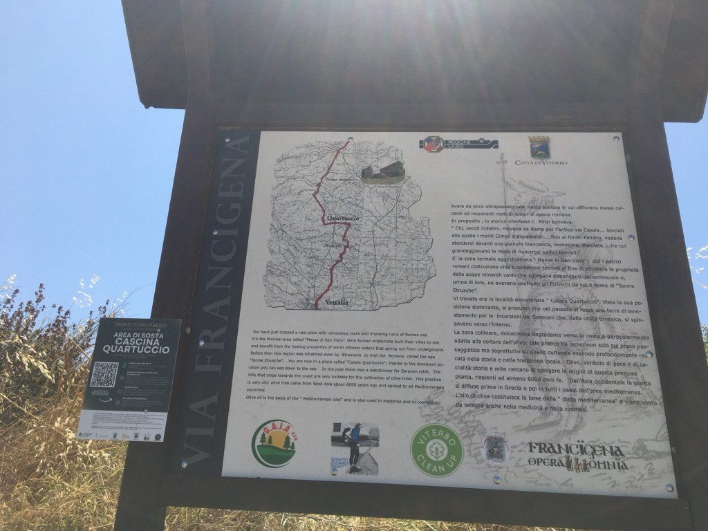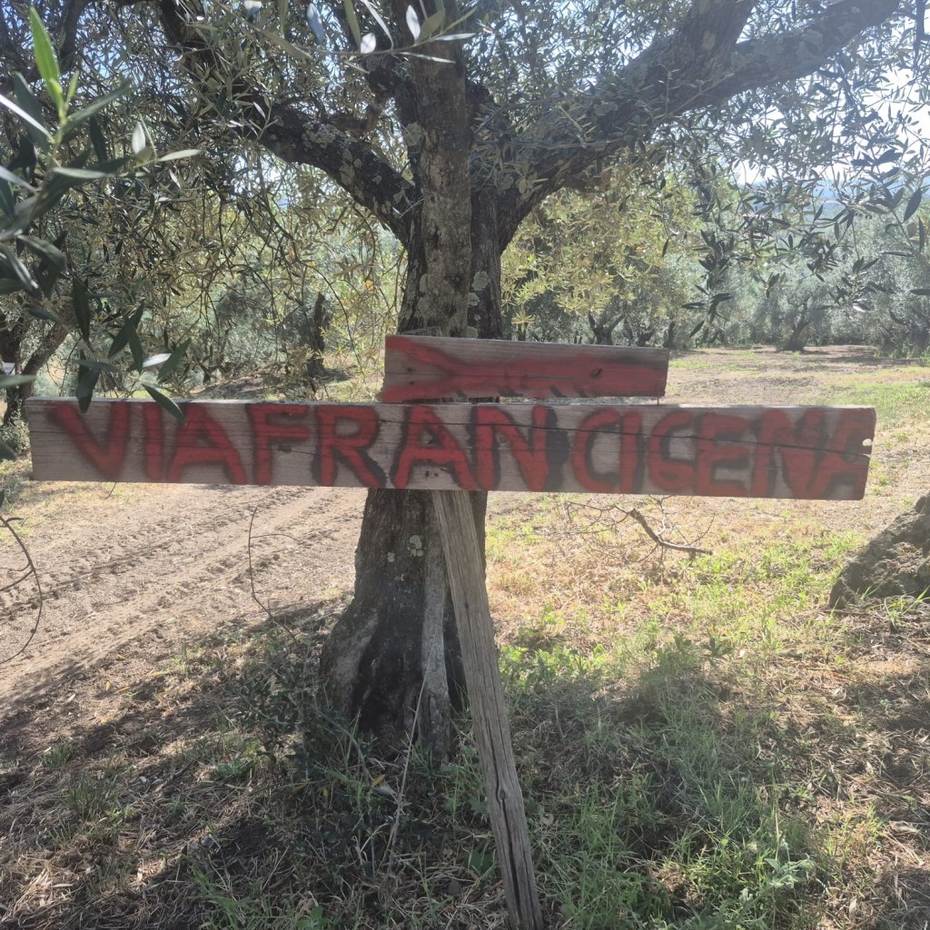 The Vie Cave, or “excavated roads,” are a network of ancient paths carved into the soft, volcanic rock (tuff) of the Maremma region in southern Italy. While not directly in Viterbo, they are nearby and easily accessible, and the area around Viterbo is known for its similar tuff formations and Etruscan history. These roads, likely of Etruscan origin, served multiple purposes, including transportation, defense, and possibly even religious rituals. Quite narrow at the top at times but providing good shade. History and Purpose: Etruscan Origins: The Vie Cave are primarily attributed to the Etruscans, an ancient civilization that thrived in central Italy before the rise of Rome. Transportation: The roads likely served as vital pathways connecting settlements, necropolises (cemeteries), and agricultural areas. Defense: Some theories suggest the deep, narrow trenches offered protection against invaders, acting as natural fortifications. Water Management: The intricate system of trenches may have also helped manage rainwater runoff, channeling water away from settlements. Religious Significance: Some scholars propose that the Vie Cave held spiritual or ritualistic importance, with evidence of sacred symbols and niches found along the paths. Re-use: The Etruscan-built roads were later used and modified by the Romans, medieval populations, and even in more recent times. Not the most photogenic walk thus far ,but we had a break at this picnic bench – rare but always welcome.Already in the high twenties Lazio – the soil a different hue; with some hills to view.Irrigation methods on a grand scale.A Hazelnut plantation.The increasingly numerous Olive grovesAfter a short, stiff climb we came upon a viewpoint looking towards the West and the Med. apparently.Butterfly having a breakI really like this form of naive artwork – it reminded me of a visit to the Museum of Naive Art in Zagreb,Croatia.Rough rather than naive..Last views before descent into rows of Olive groves as we neared Vetrella .This little spot by a gateway offered a “timbro“ – a stamp for your pilgrim passportThere was also a notebook inviting you to offer your thoughts on the Via Francigena.Fruit trees of some description made a change from the olives .A wine store on the last leg ( and ours ) of today’s trail.After 11.26 miles we were relieved to be there – it’s not so much the distances or the terrain – it’s the heat …33* @ 14.00.Our digs for tonight A very relaxing space – the garden – bright, refurbished rooms, too. The first real rain we have experienced started at 17.00 – some thunder – finishing by 19.00. Forecast for the remainder of the week is in the 30s