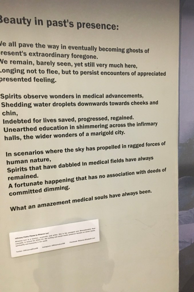 Opened in 1922 .Autumnal colours along Barbourne Brook. The first thing to catch our attention was a striking sculpture.GHELUVELT is also the name of the park .A very striking memorialThe bandstand was located above the pond and we could just imagine a summer scene with live music . Throughout the summer bands regularly perform on the bandstand.We walked to our coffee stop – the recently restored Victorian pump house which is also an environmental centre.An almost brand new Footbridge across the River SevernWhere did they come from?The Severn,200 miles and the longest river in England.After a few hundred metres, the towpath took us by some riverside residences fortified in different ways against flooding.A relatively modern construction Natural defences.A decorative descent to the river – hope the garden furniture doesn’t float away .Trees – Self Optimising Structures…if you get my drift.Worcestershire Race Course across the river .Taking us towards another impressive footbridge.Crossing towards the racetrack River view from the footbridge.“Keep On Running” or in our case rambling!Railway Bridge corner,galloping towards the finish…The University has a number of campuses around the city.We were bound for The Infirmary ( no jokes please ) – being a Monday it was one of the few sites open. The Infirmary Museum is an interactive exhibition at the University of Worcester’s City Campus combining history, science, art and technology to explore the medical stories of one of England’s oldest infirmaries.