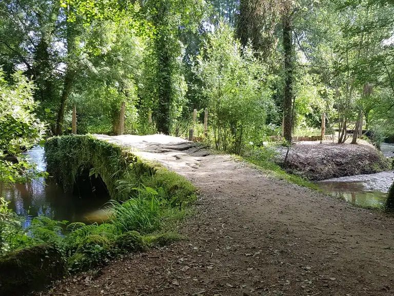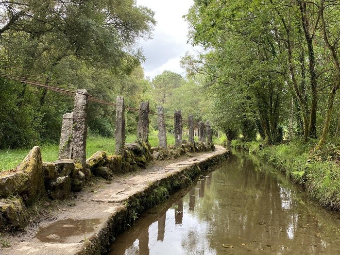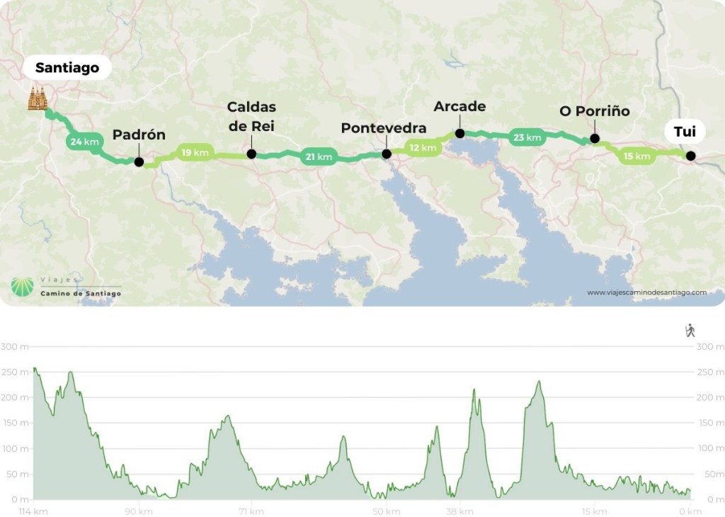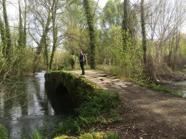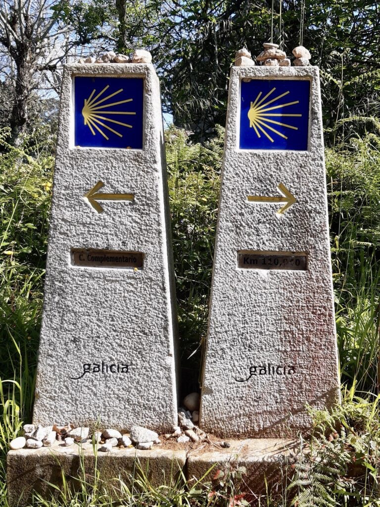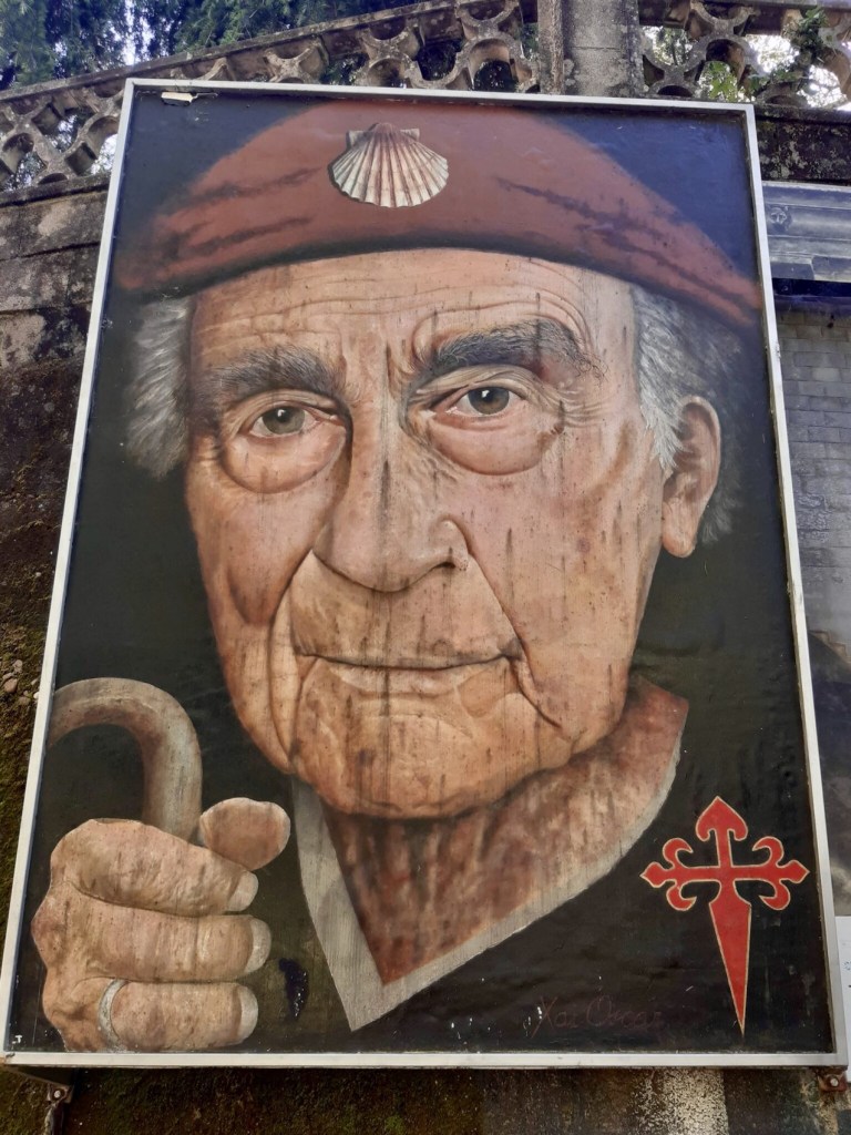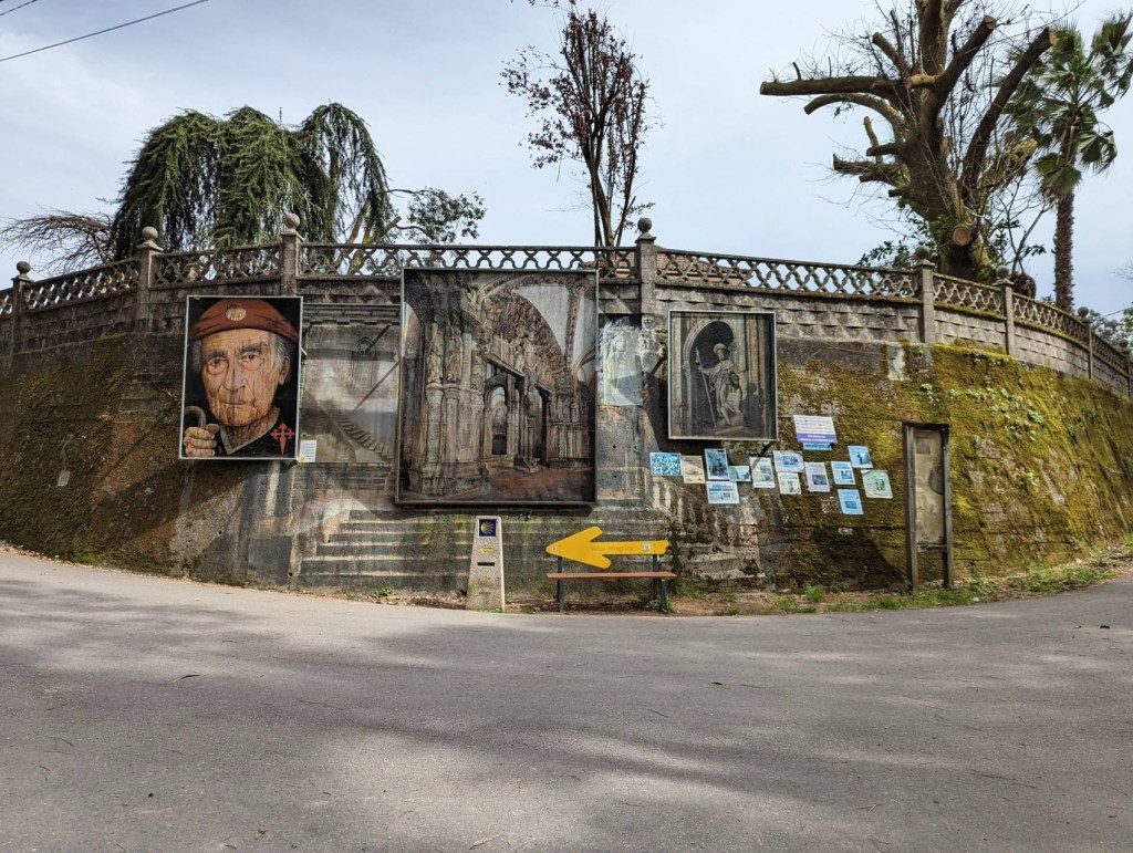 When I first walked the final section of this stage into O PORRINO,it was alongside a large industrial estate and if was quite malodorous. We renamed the town Oh No Porrino! However, a new route along the River Louro now makes this avoidable.Tui is a popular starting point for Pelegrinos as the distance to Santiago is long enough to qualify for a Compostela. it is worth remembering that if you wish to qualify for a Compostela,you need two stamps a day throughout Galicia.The nuns’ tunnel – Tunel das Monxas through which we pass on the way out of Tui. To avoid walking alongside the N550 we can take the paseo fluvial towards the Cathedral, which is the official starting point of this stage.Catedral de Santa Maria – Sello? The Convento de Santo Domingo (Convent of Saint Dominic) in Tui, Spain, is a 14th-century religious complex originally founded in 1330. Situated overlooking the Miño River, it is a primary example of mendicant Gothic architecture in Galicia. Praza San Bartolome – one of the oldest suburbs of Tui. we then leave the town behind and turn down on to a medieval bridge .We do not cross the bridge over the Rio Louro but turn left along the ancient Via Romana XIX.Who will be tempted to have their photo taken here?The Capella da Virxe do Camino. The Camino crosses the A55 motorway along a dedicated pilgrim track with a timber safety barrier,following this we go under the AP-9 and shortly afterwards turn back over the motorway to enter some woodland.Cruceiro San Telmo – also known as the Ponte das Febres. Here San Telmo fell sick and died of a fever in 1251 on his way back from a pilgrimage to Santiago de Compostela. I remember stopping here for a bag break on my solo Portuguese Camino ; I didn’t stay long it was damp day and a mournful place.Following the waymarks after crossing the bridge – the yellow arrows are important here as there are local walking routes in the area. Eventually to Ribadelouro where there is a Cafe Casa Cultura.We cross the Puente Orbenlle and continue upto the road.The mural is of the Portico de Gloria ( Santiago Cathedral) and the way mark directs to the “new” scenic route avoiding the industrial area referred to earlier. Signs here are often obliterated by local businesses on the original “ industrial’ route ! Arrows on the road painted out in black. We turn left,keeping a careful eye as further waymarks may have been removed.No confusion – we take the “ complementary “ route to the left.