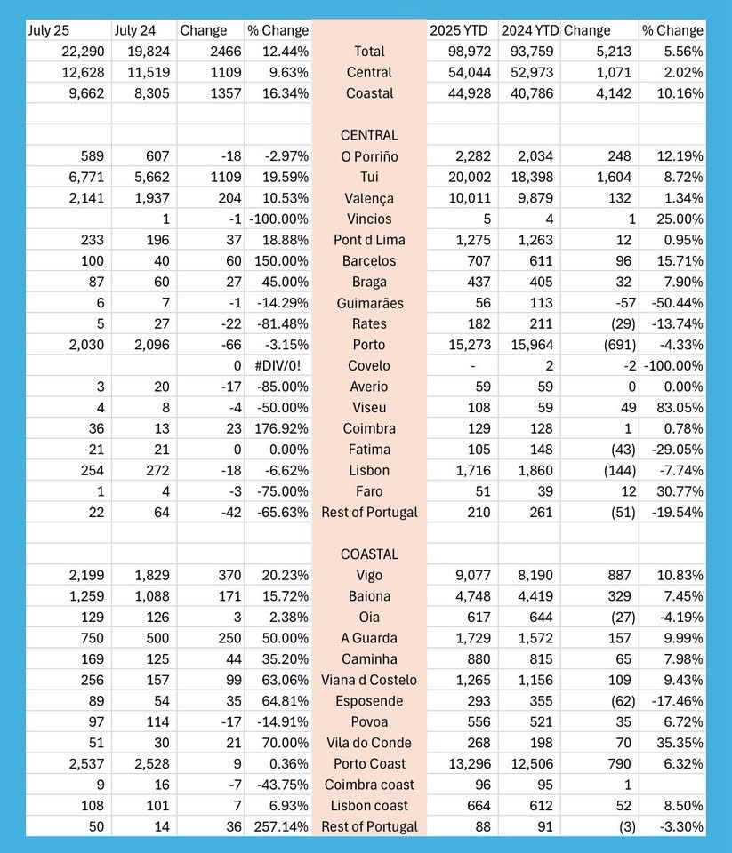 The July numbers are now available. Both the Coastal and Central Routes were busier than last year. With St. James’ feast day on July 25, that week was busier than the rest of the month in Santiago. The 100 km cities still are very popular with just over 75% of walkers on the Central Route beginning in O’Porriño, Tui or Valença. On the Coastal Route, just over 35% began in Baiona or Vigo.